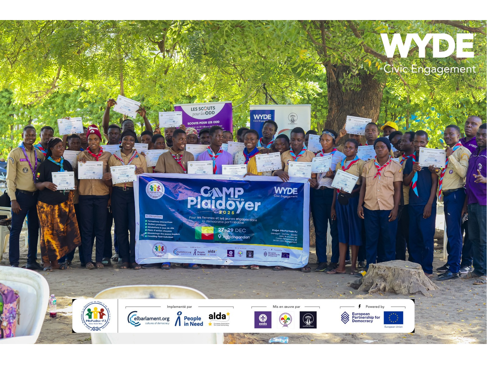 Du 27 au 29 décembre 2025, le centre scout d’Agblangandan dans la commune de Sèmè-Kpodji a accueilli un Camp National de Plaidoyer, organisé dans le cadre du projet PReParDem-FJ (Renforcement de la participation des jeunes et des femmes à la démocratie participative), mené au Bénin, au Sénégal et en Guinée.. Dans un contexte où la voix des jeunes reste encore peu présente dans les espaces de décision, cinquante (50) jeunes leaders venus de plusieurs communes du pays ont pris part à cette rencontre de formation et d’échanges. L’objectif était d’outiller une nouvelle génération de citoyens engagés capables d’influencer les politiques publiques à travers des actions de plaidoyer structurées, pacifiques et efficaces.